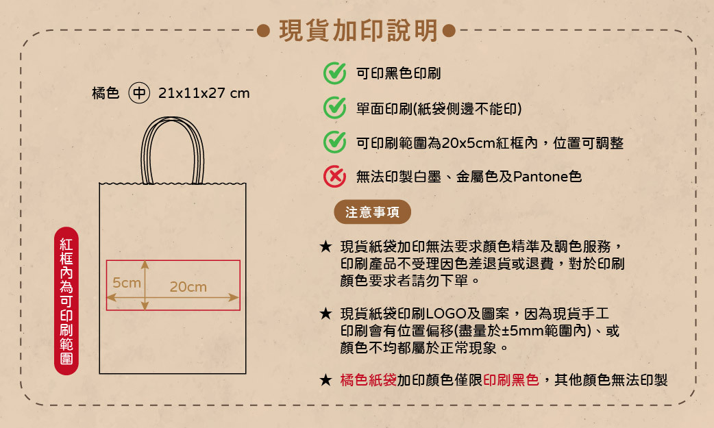 ▪︎ 橘色紙袋加印顏色僅限印刷黑色,其他顏色無法印製。