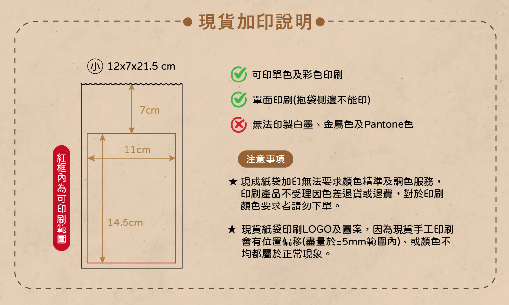 ▪︎ 紙袋現貨加印(CMYK)會有正常色差、位移偏移問題,不接受因上述理 由退貨、重製、退費、折扣。